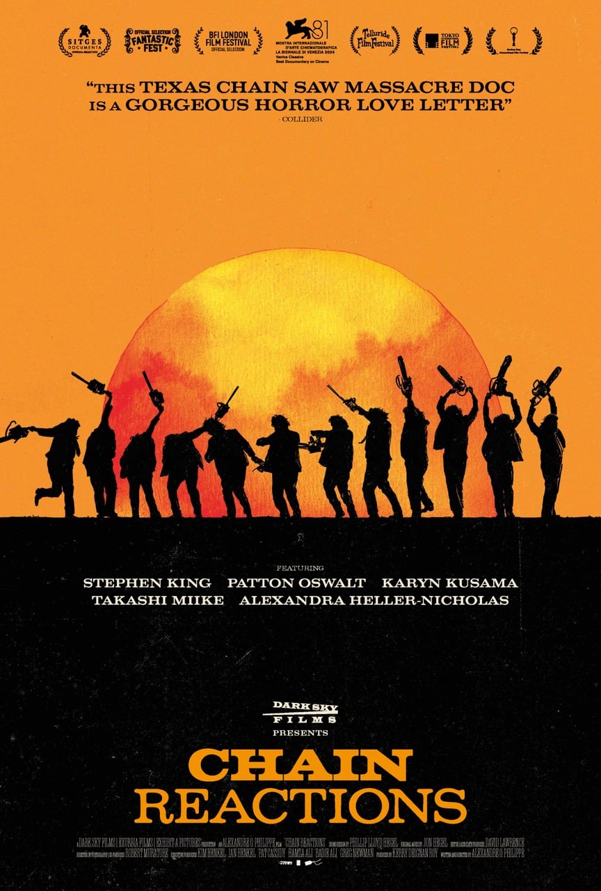 Fifty years after Tobe Hooper’s THE TEXAS CHAIN SAW MASSACRE shocked the world and forever changed the face of global cinema and popular culture, CHAIN REACTIONS charts the film’s profound impact and lasting influence on five great artists-Patton Oswalt, Takashi Miike, Alexandra Heller-Nicholas, Stephen King, and Karyn Kusama-through early memories, sensory experiences, and childhood trauma.